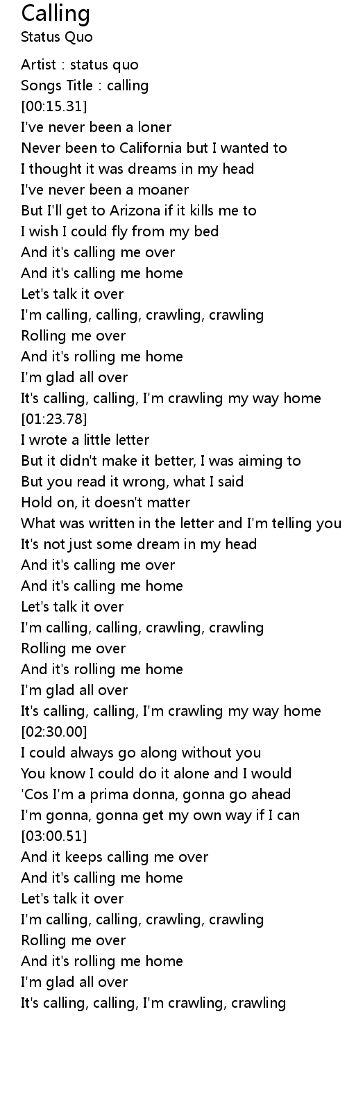 | [02:07.75] | I'm calling, calling, crawling, crawling |