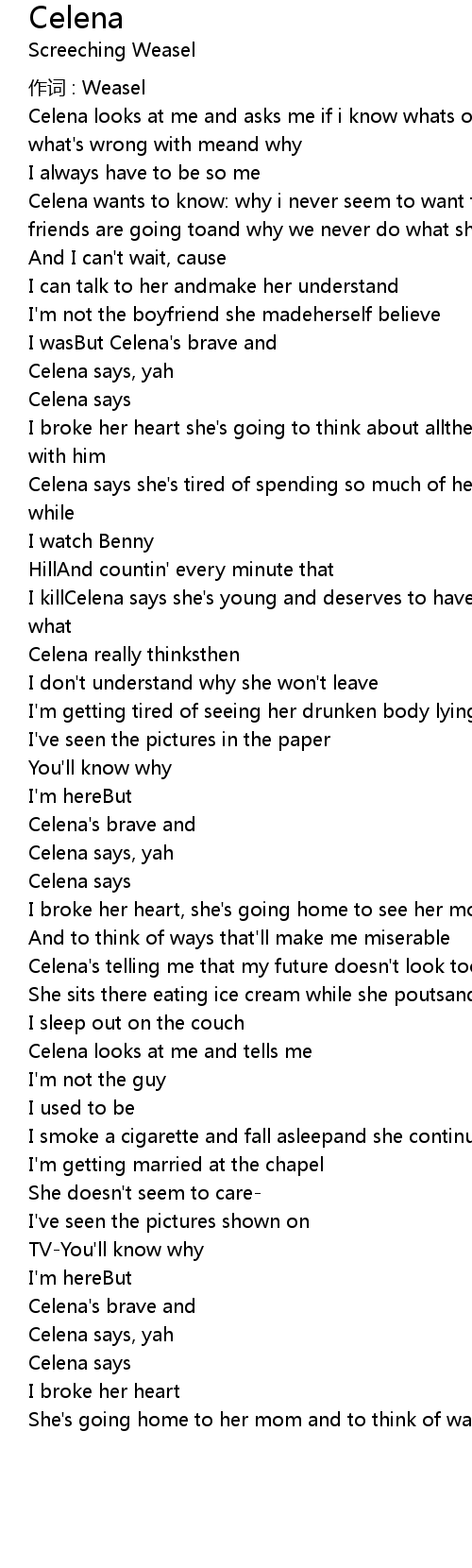 | Celena says she's tired of spending so much of herprecious time watchin' me while | |