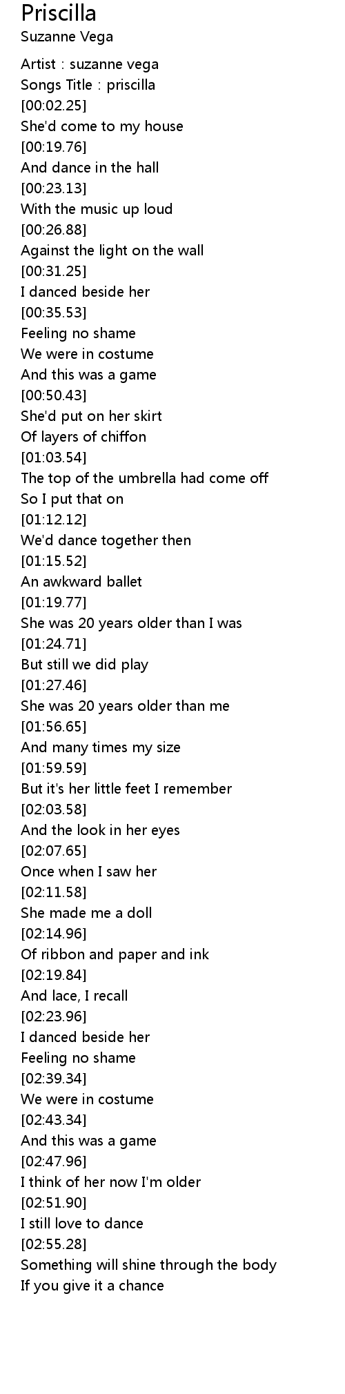 | [00:01.18] | Songs Title: priscilla |