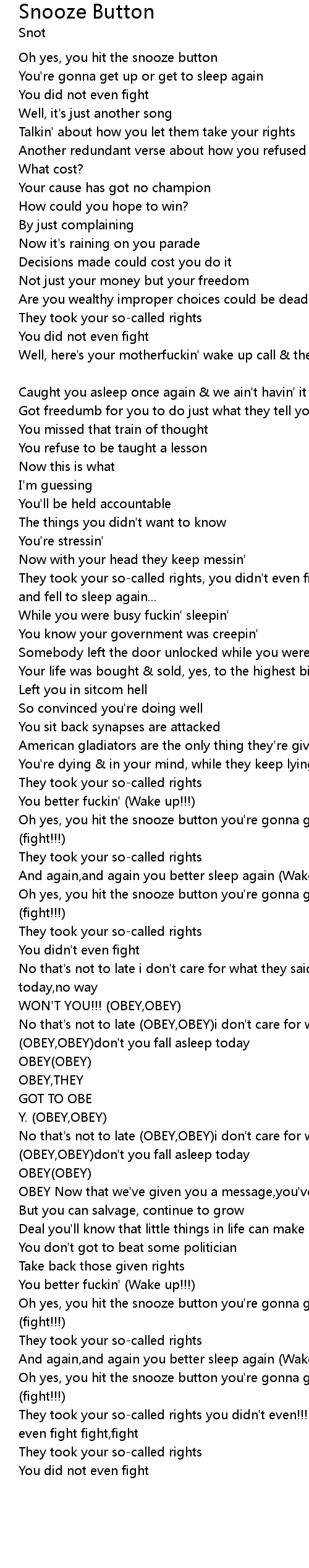 | No that's not to late (OBEY,OBEY)i don't care for what they said (OBEY,OBEY)don't you fall asleep today | |