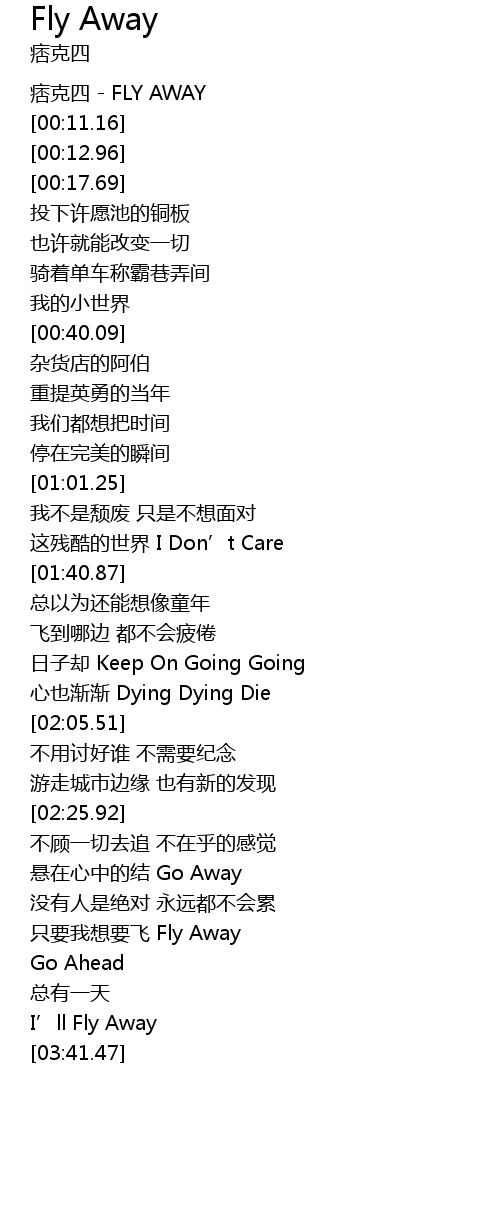 | [00:01.33] | pǐ kè sì FLY AWAY |
