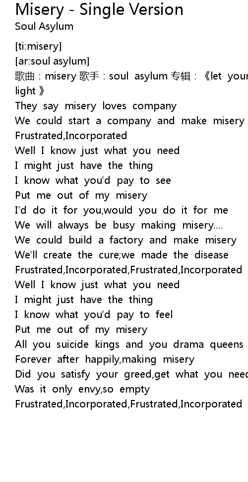 | [00:05.71] | 歌曲:misery 歌手:soul asylum 专辑:《let your dim light 》 |
