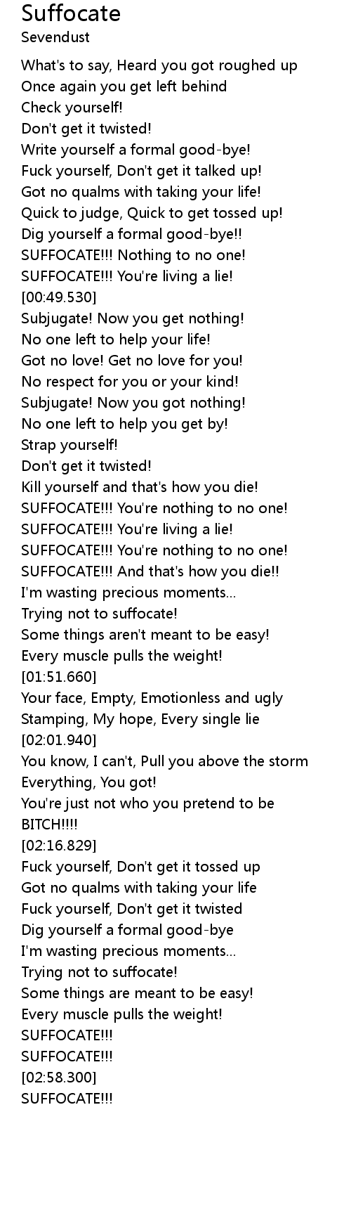 | [01:18.620] | SUFFOCATE!!! You' re living a lie! |