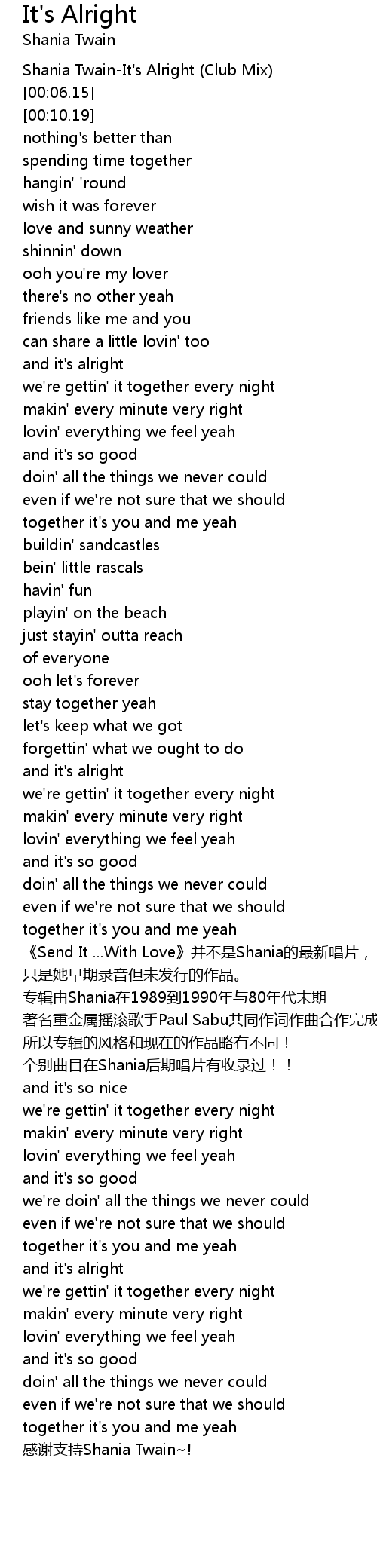 | [00:01.03] | Shania TwainIt' s Alright Club Mix |