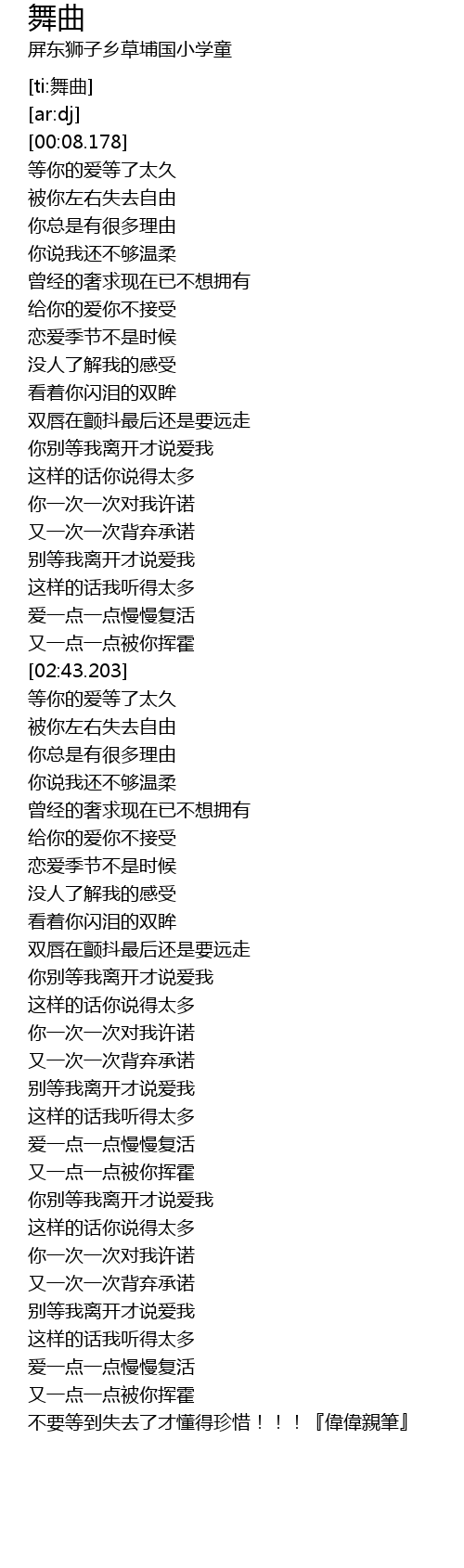 | [05:03.273] | 不要等到失去了才懂得珍惜!!!『偉偉親筆』 |