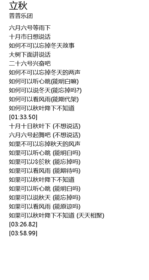 | [01:56.47] | 十月十日秋叶下 (不想说话) |