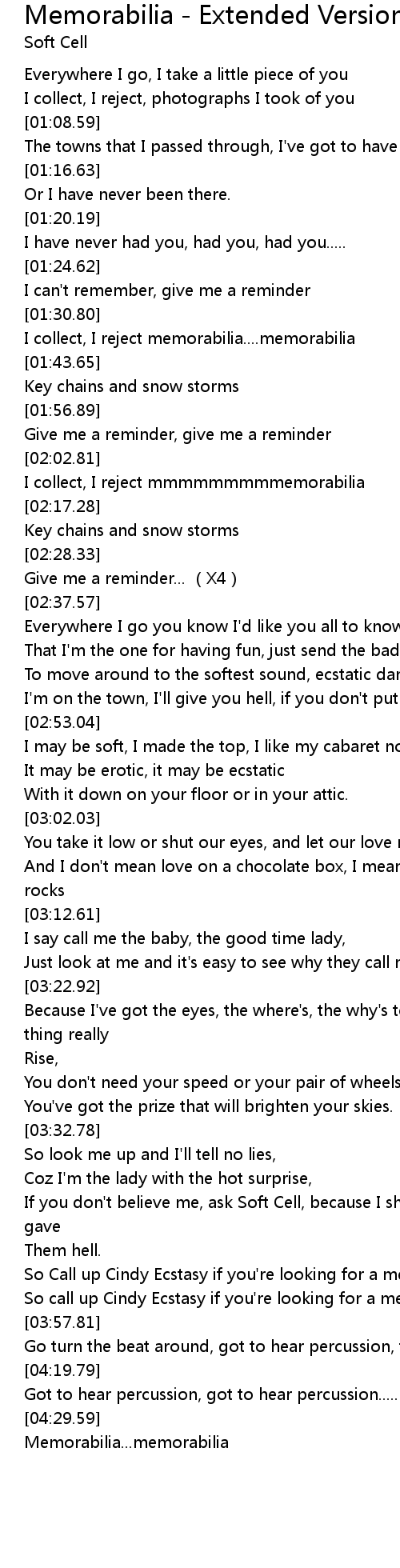 | [01:31.49] | I collect, I reject memorabilia....memorabilia |