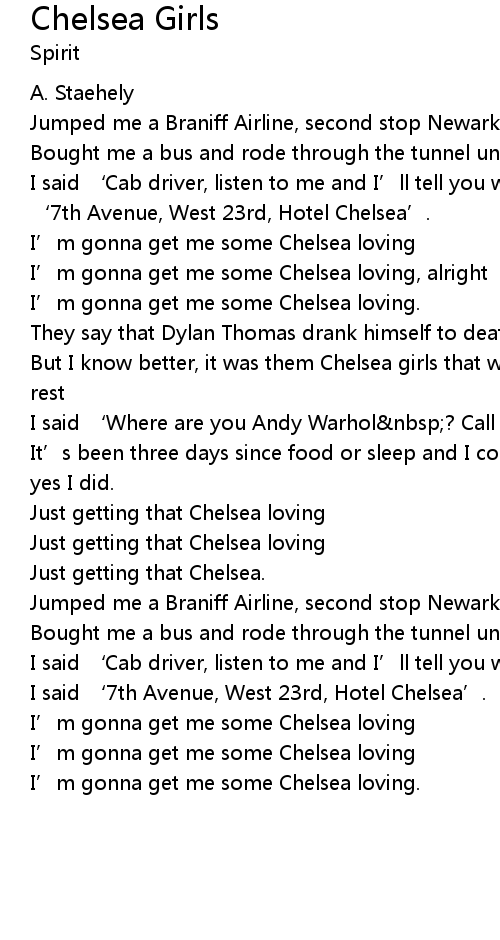 | But I know better, it was them Chelsea girls that wouldn' t give that boy no rest | |