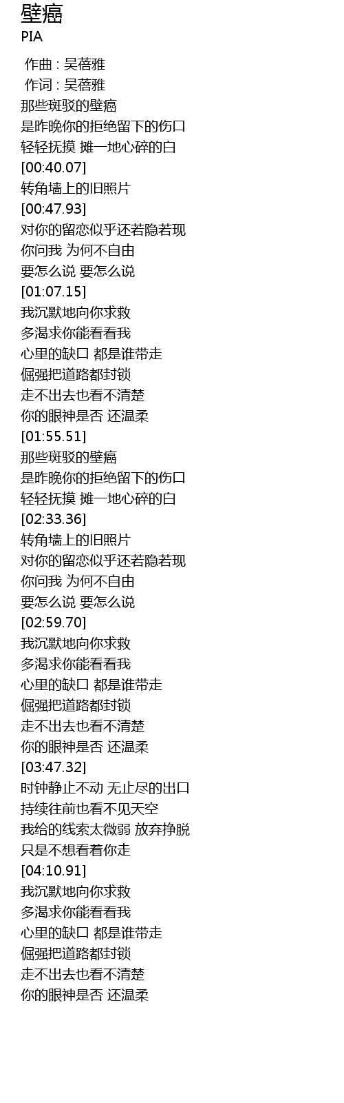 | [00:01.00] | 作词 : 吴蓓雅 |