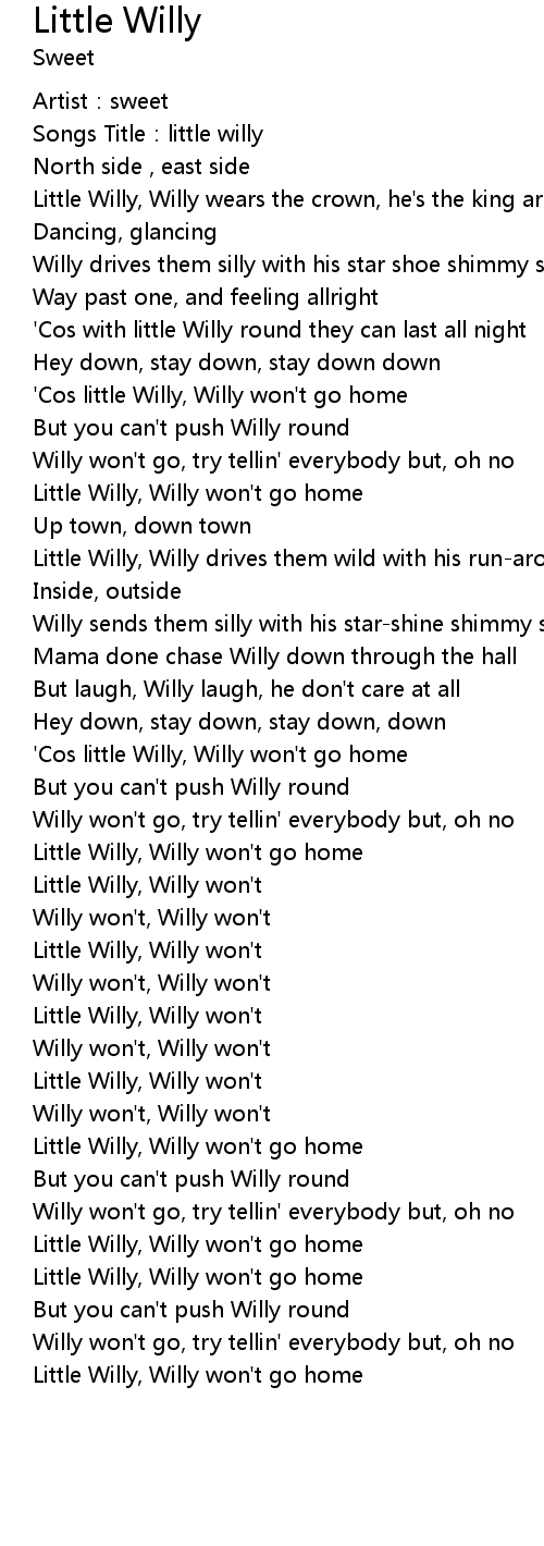 | [00:50.75] | ' Cos little Willy, Willy won' t go home |