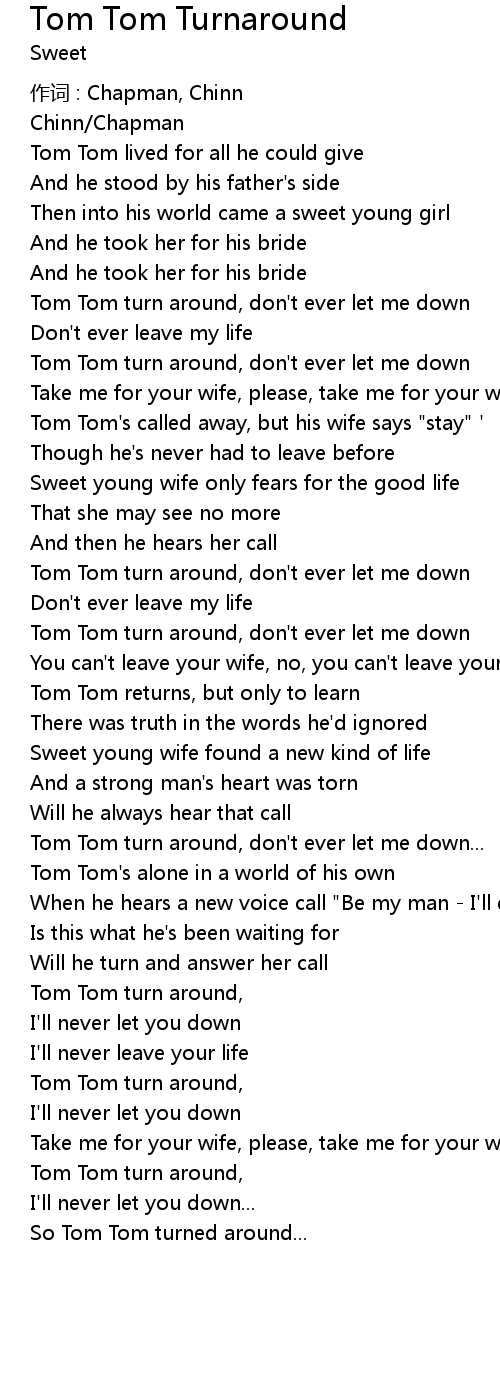 | Tom Tom turn around, don' t ever let me down | |