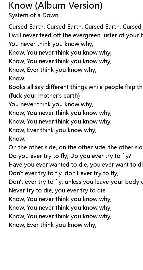 | Books all say different things while people flap their yellow wings trying to soar by being a whore of life and almost everything the sheep that ran off from the herd may be dead but now' s a bird able to fly able to die able to break your cursed earth | |