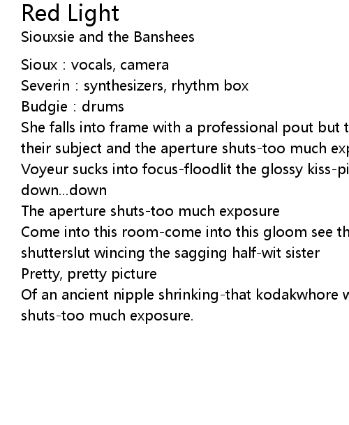 | Come into this room-come into this gloom see the red light rinsing another shutterslut wincing the sagging half-wit sister | |