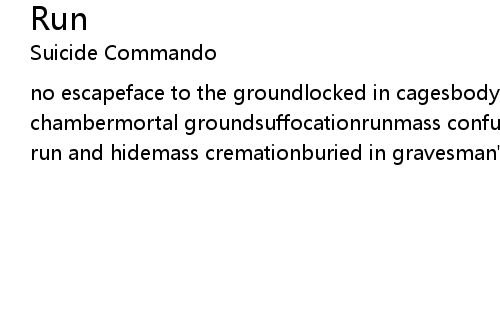| no escapeface to the groundlocked in cagesbody countno way outnerve gas chambermortal groundsuffocationrunmass confusionrun and hidemass delusionjust run and hidemass cremationburied in gravesman's creationman's true facerun |