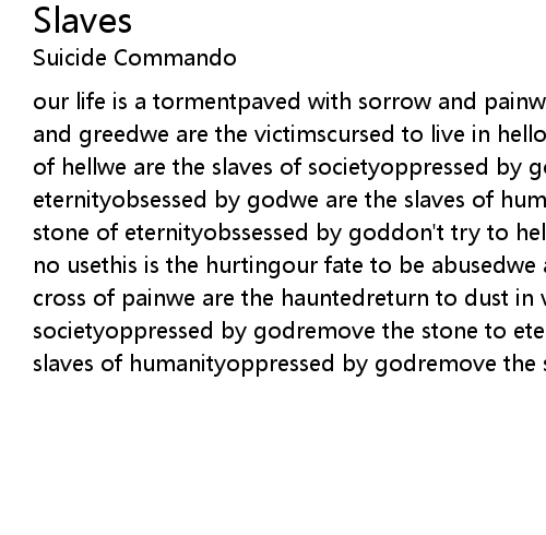 our life is a tormentpaved with sorrow and painwe are the martyrsslaves of money and greedwe are the victimscursed to live in hellobey the systemshow me the face of hellwe are the slaves of societyoppressed by godremove the stone of eternityobsessed by godwe are the slaves of humanityoppressed by godremove the stone of eternityobssessed by goddon't try to help medon't care, there's really no usethis is the hurtingour fate to be abusedwe are the torturedwe'll carry the cross of painwe are the hauntedreturn to dust in vainwe are the slaves of societyoppressed by godremove the stone to eternityobsessed by godwe are the slaves of humanityoppressed by godremove the stone to eternityobsessed by god |