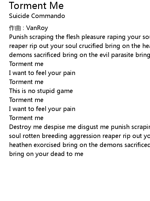 | Punish scraping the flesh pleasure raping your soul rotten breeding aggression reaper rip out your soul crucified bring on the heathen exorcised bring on the demons sacrificed bring on the evil parasite bring on your death to me | |