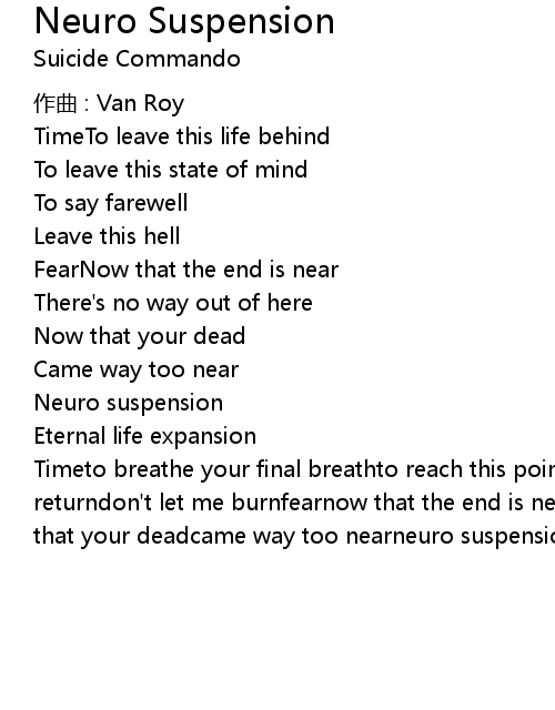 | Timeto breathe your final breathto reach this point of deadthere' s no returndon' t let me burnfearnow that the end is nearthere' s no way out of herenow that your deadcame way too nearneuro suspensioneternal life expansion |