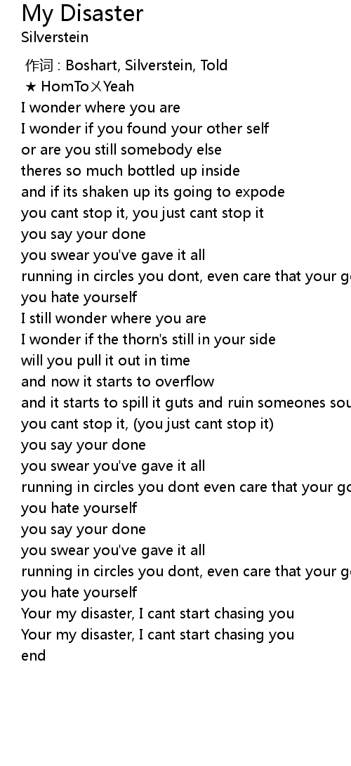 | [03:33.15] | Your my disaster, I cant start chasing you |