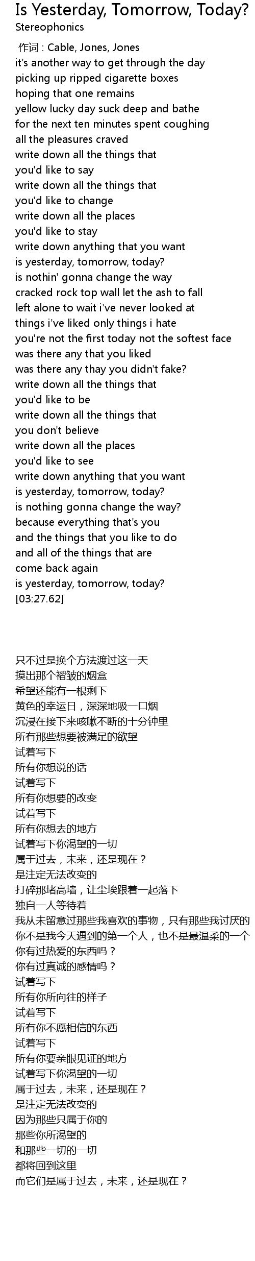 | [03:19.14] | is yesterday, tomorrow, today? |