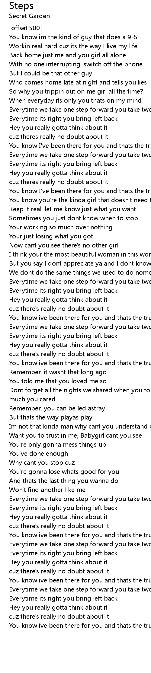 Dont forget all the nights we shared when you told me girl just how much you cared |