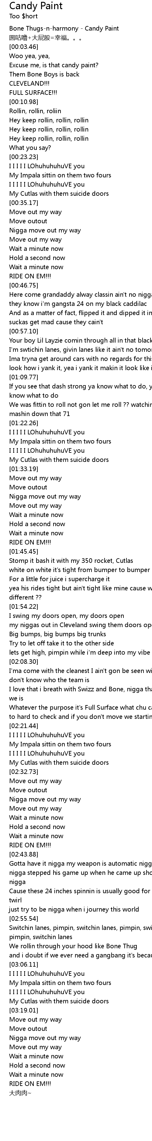 | [00:01.00] | Bone Thugsnharmony Candy Paint |