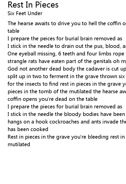 God not another dead body the cadaver is cut up and cut up again gutted and split up in two to ferment in the grave thrown six feet down one piece at a time for the insects to find rest in pieces in the grave you're bleeding rest in pieces in the tomb of the mutilated the hearse awaits to drive you to hell the coffin opens you're dead on the table |