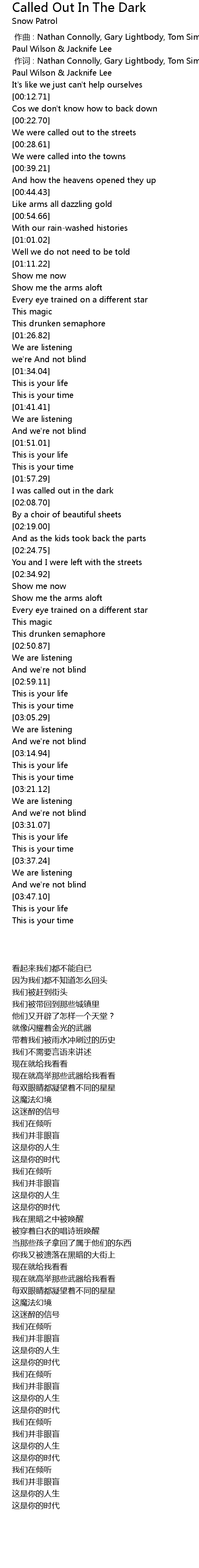 | [00:01.00] | zuò cí : Nathan Connolly, Gary Lightbody, Tom Simpson, Jonny Quinn, Paul Wilson Jacknife Lee |