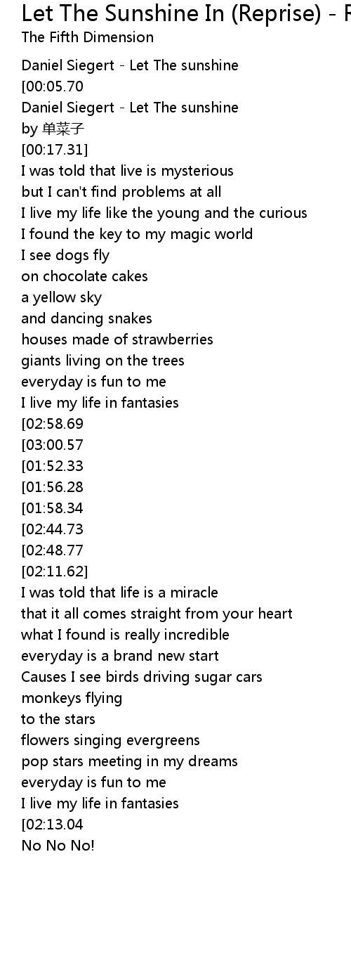 | [03:02.70][02:58.69][02:55.47][02:32.08][01:48.17][00:53.77] | I let the sunshine |