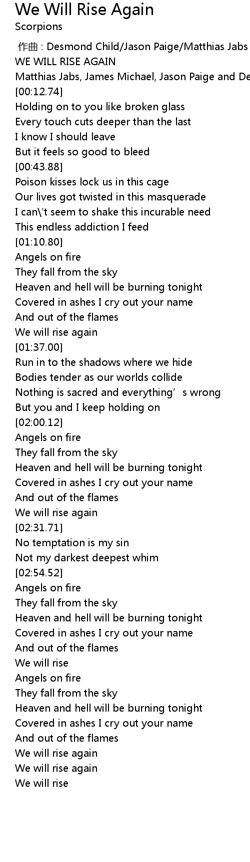 | [00:08.35] | Matthias Jabs, James Michael, Jason Paige and Desmond Child |