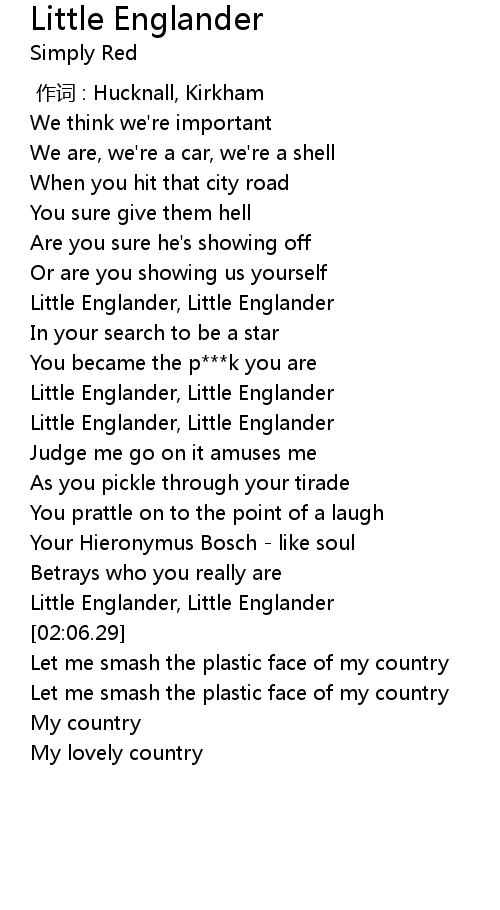 | [00:54.23] | Little Englander, Little Englander |