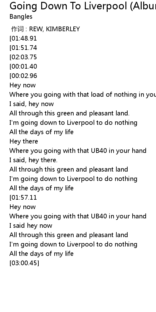 | [03:10.94][01:51.74][00:04.67] | The Bangles Going Down To Liverpool |