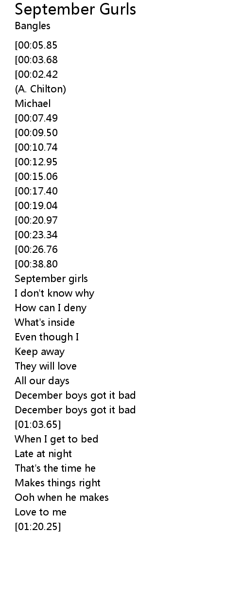 | [01:24.76][00:03.68] | The Bangles - September Gurls |
