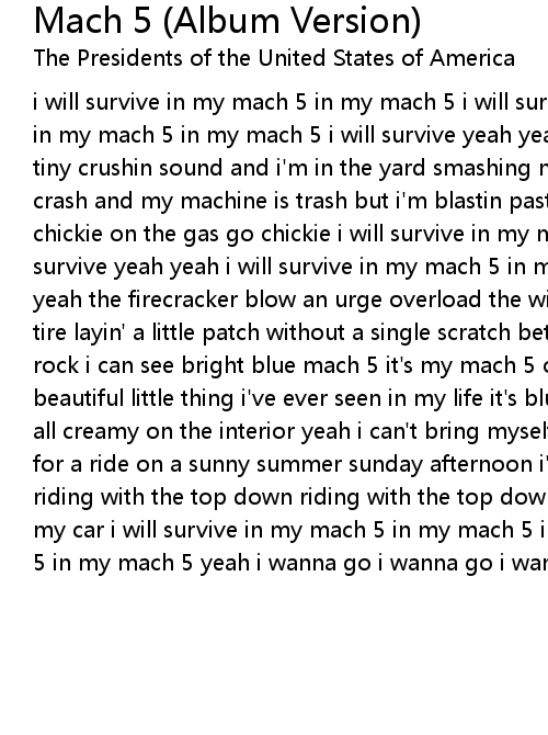 i will survive in my mach 5 in my mach 5 i will survive yeah yeah i will survive in my mach 5 in my mach 5 i will survive yeah yeah i bring the hammer down a tiny crushin sound and i'm in the yard smashing match box cars an itty bitty crash and my machine is trash but i'm blastin past with chickie on the dash chickie on the gas go chickie i will survive in my mach 5 in my mach 5 i will survive yeah yeah i will survive in my mach 5 in my mach 5 i will survive yeah yeah the firecracker blow an urge overload the wild plastic fire smoke from the tire layin' a little patch without a single scratch between the hammer and the rock i can see bright blue mach 5 it's my mach 5 oh oh my goodness it's the most beautiful little thing i've ever seen in my life it's blue on the outside and all creamy on the interior yeah i can't bring myself to smash it so i take it for a ride on a sunny summer sunday afternoon i'm riding with the top down riding with the top down riding with the top down hell i blew the top right of my car i will survive in my mach 5 in my mach 5 i will i will survive in my mach 5 in my mach 5 yeah i wanna go i wanna go i wanna go i wanna go |