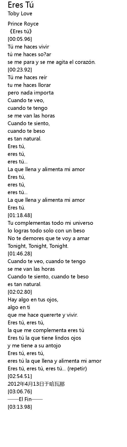 | [02:47.96] | Eres tu, eres tu, eres tu... repetir |