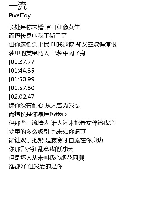 | [02:21.02][01:37.77][00:37.87] | 为何认识你 你不是完美 |