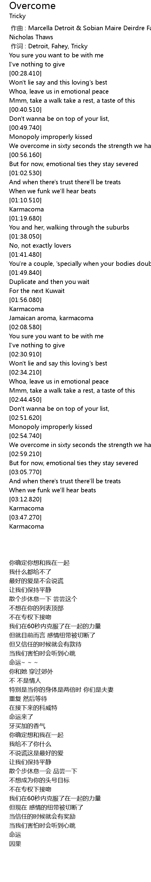 | [00:01.00] | 作词 : Detroit, Fahey, Tricky |