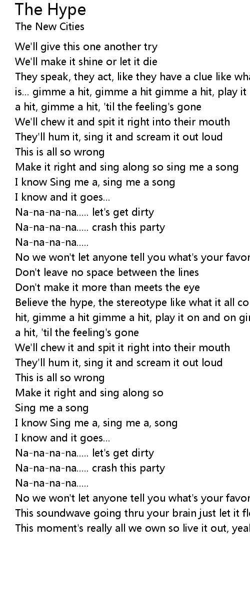 Believe the hype, the stereotype like what it all comes down to... is... gimme a hit, gimme a hit gimme a hit, play it on and on gimme a hit, gimme a hit, gimme a hit, 'til the feeling's gone |