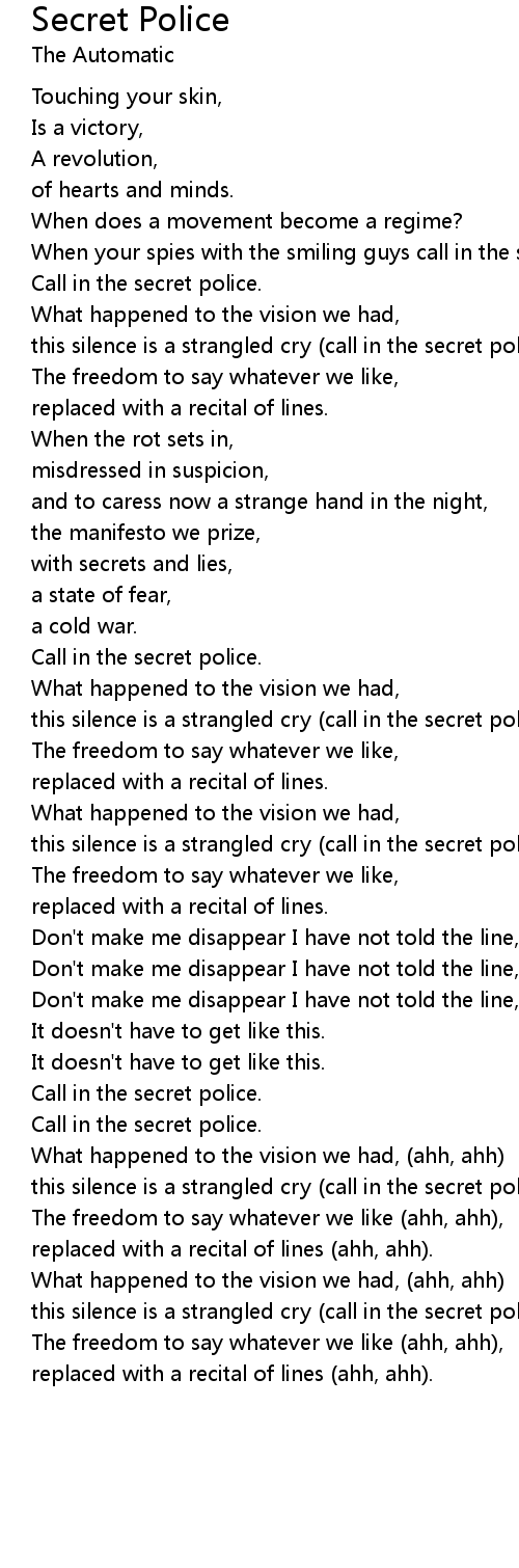 this silence is a strangled cry (call in the secret police) (ahh, ahh). |