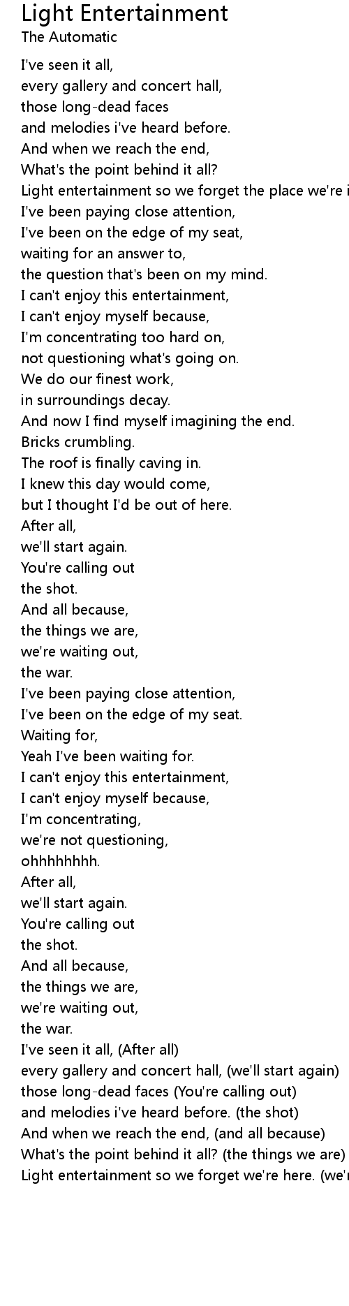 Light entertainment so we forget we're here. (we're waiting out, the war). |