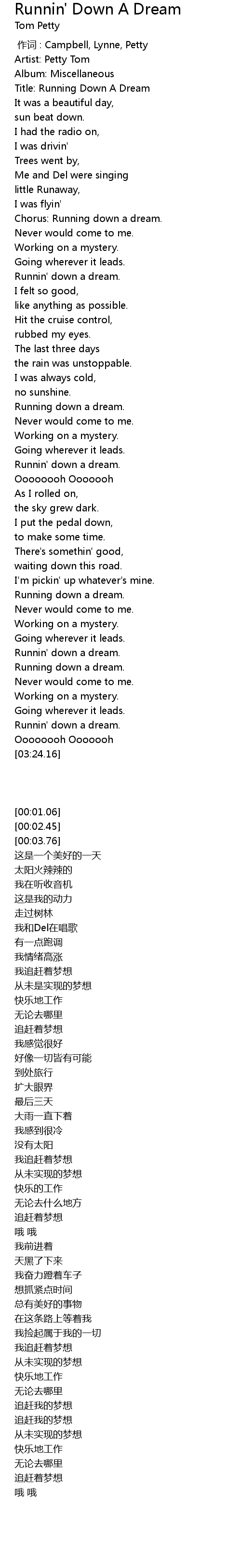 | [00:03.76] | Title: Running Down A Dream |