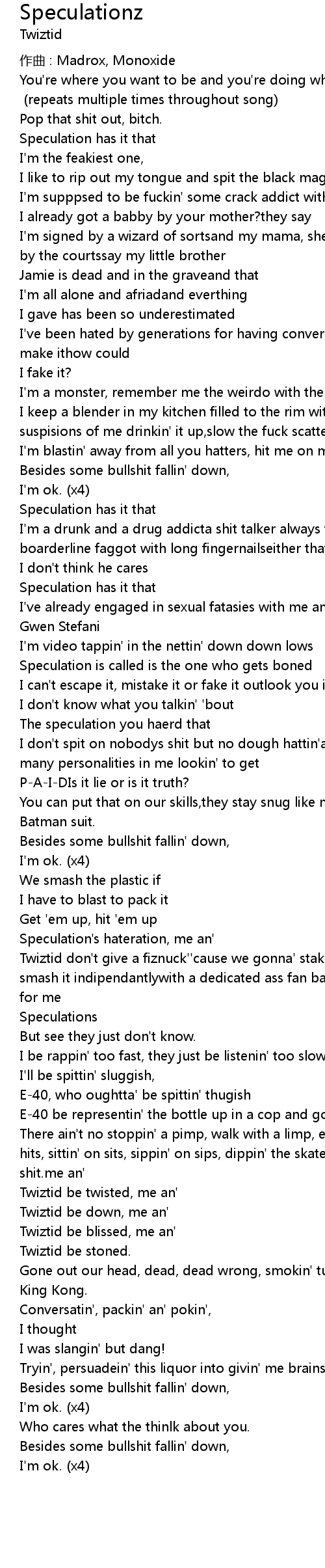 | Twiztid don't give a fiznuck''cause we gonna' stake an' take it up a state an' smash it indipendantlywith a dedicated ass fan base that'll do a motherfucker in for me | |