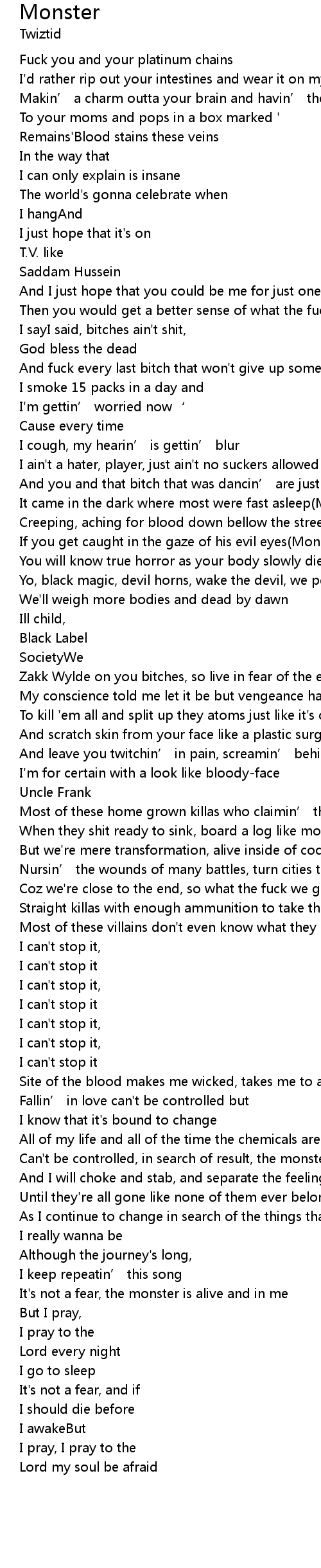 | Creeping, aching for blood down bellow the streets(Monster) | |