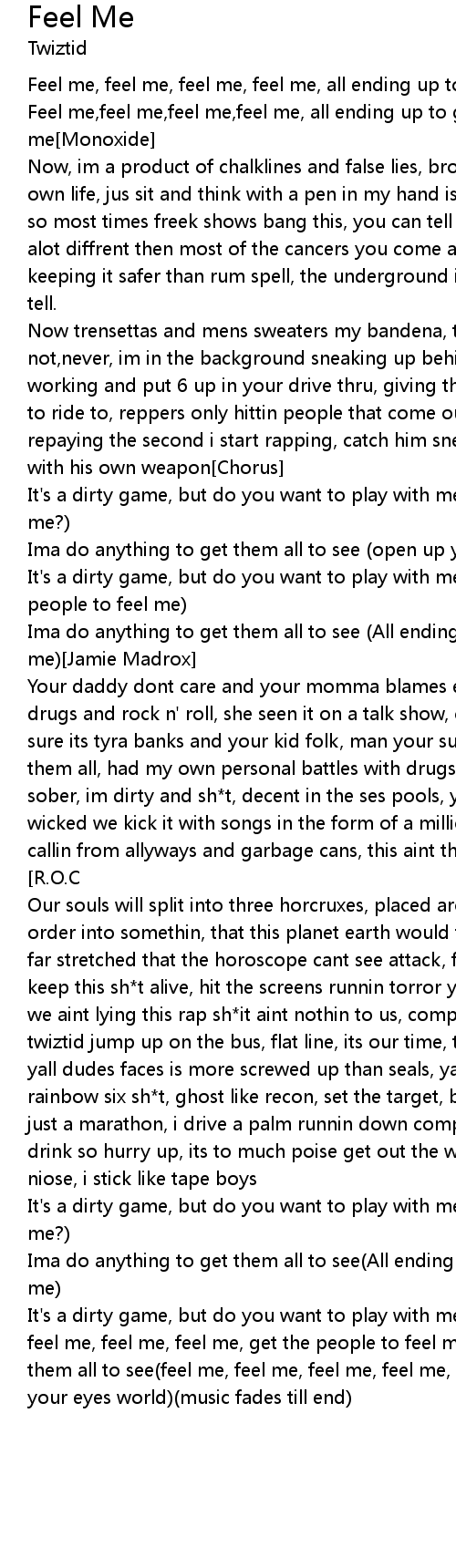 It's a dirty game, but do you want to play with me?(feel me, feel me, feel me, feel me, feel me, feel me, get the people to feel me)i will do anything to get them all to see(feel me, feel me, feel me, feel me, feel me, feel me, open up your eyes world)(music fades till end) |
