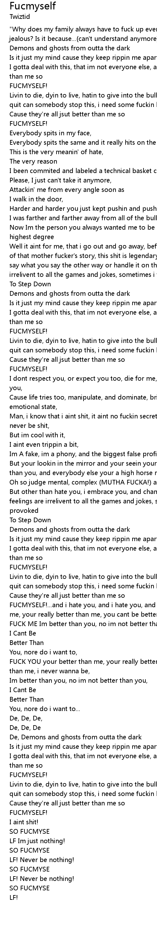 FUCMYSELF!...and i hate you, and i hate you, and i hate you..your better than me, your really better than me, you cant be better than me, i never wanna be, |