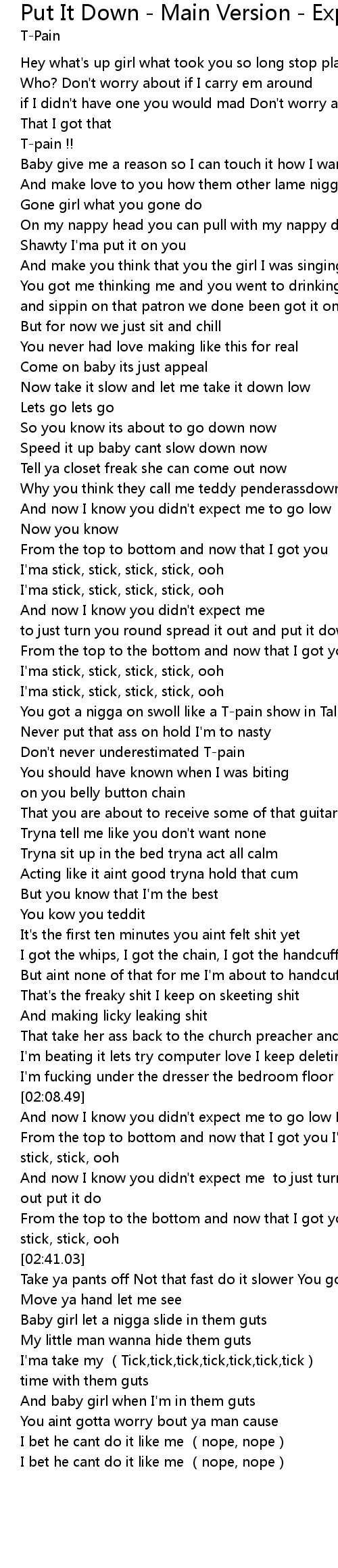 | [02:44.96] | Take ya pants off Not that fast do it slower You gone ruin the mood |