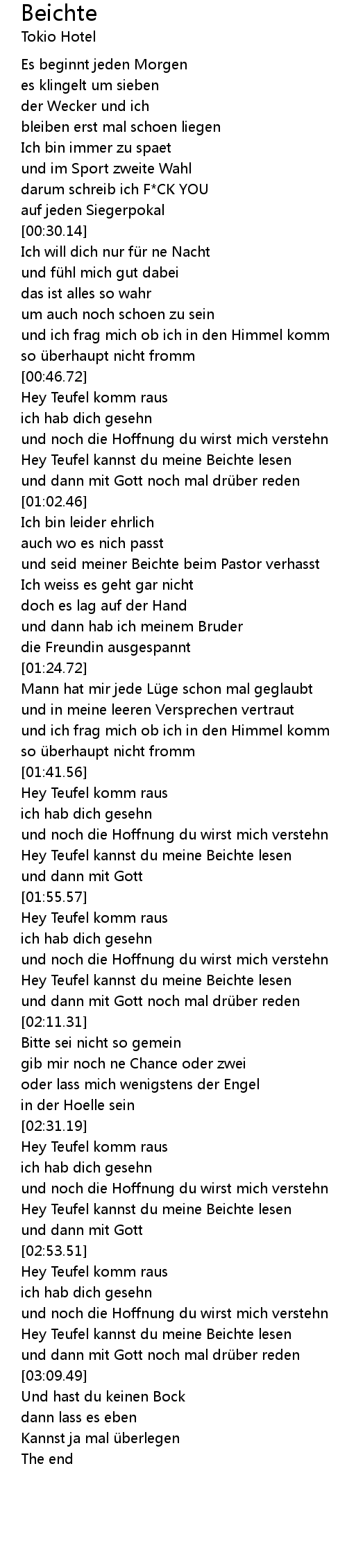 | [00:53.97] | Hey Teufel kannst du meine Beichte lesen |