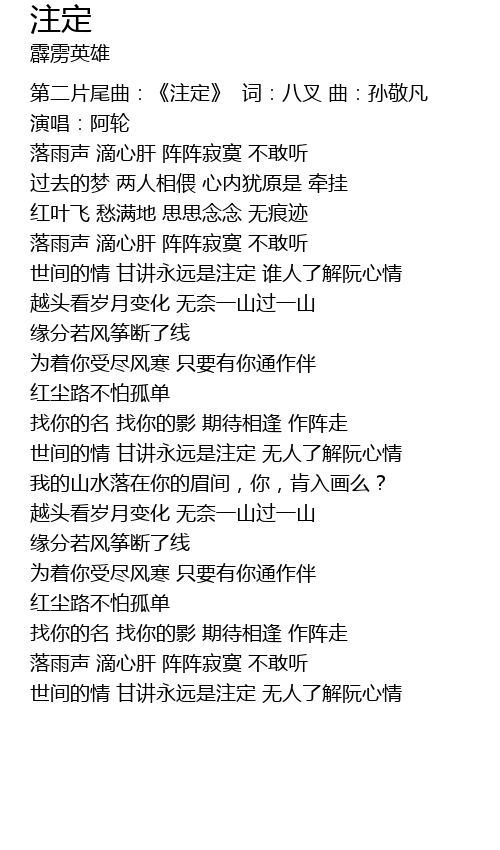 | [00:00:00] | 第二片尾曲:《注定》 词:八叉 曲:孙敬凡 演唱:阿轮 |