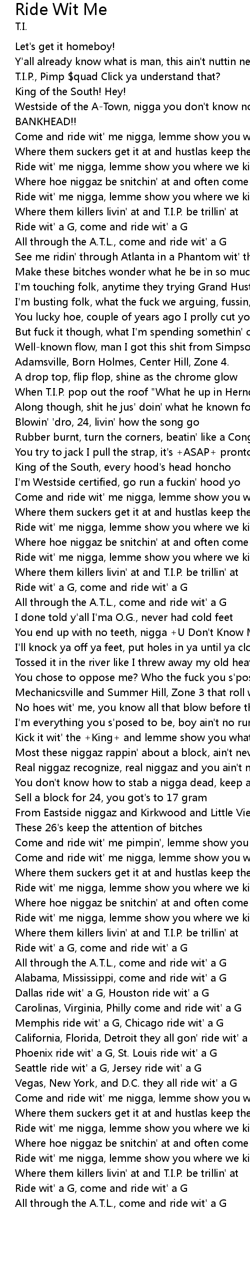 | [00:23.61] | Come and ride wit' me nigga, lemme show you where we kick it at |