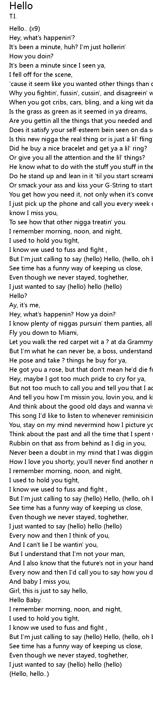 | [02:58.350] | Girl, this is just to say hello, |
