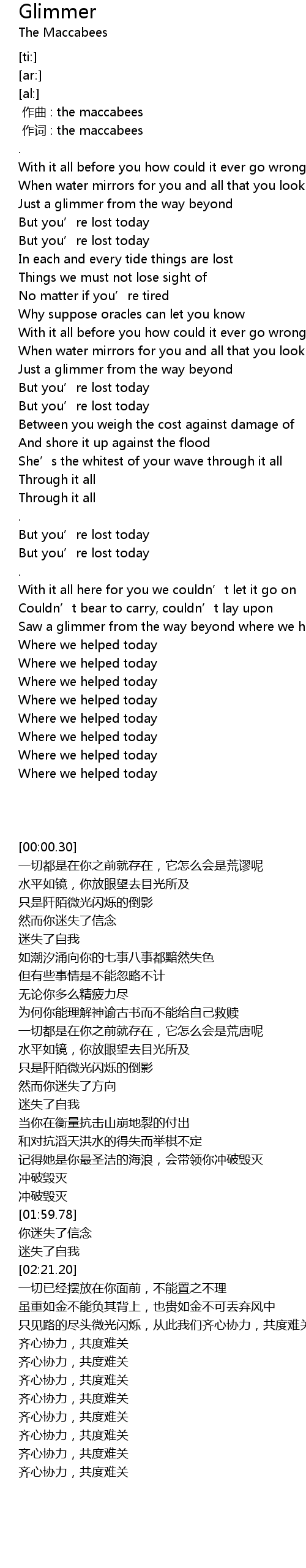 | [02:59.00] | 只见路的尽头微光闪烁,从此我们齐心协力,共度难关 |